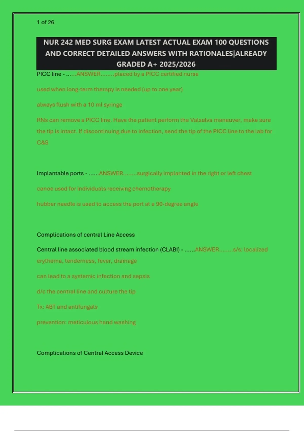 This detailed study guide covers essential topics for the NUR 242 Medical-Surgical Nursing exam, including central line management, sickle cell crisis, infection control, pressure injury prevention, wound care, perioperative nursing, and geriatric health. Each question includes correct answers with thorough rationales to reinforce clinical reasoning. Ideal for nursing students preparing for exams or clinical practice, this resource aligns with the latest evidence-based guidelines and promotes safe, effective patient care.