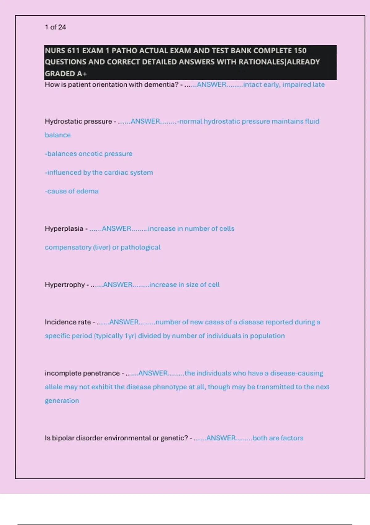 NURS 611 EXAM 1 PATHO ACTUAL EXAM AND TEST BANK COMPLETE 150