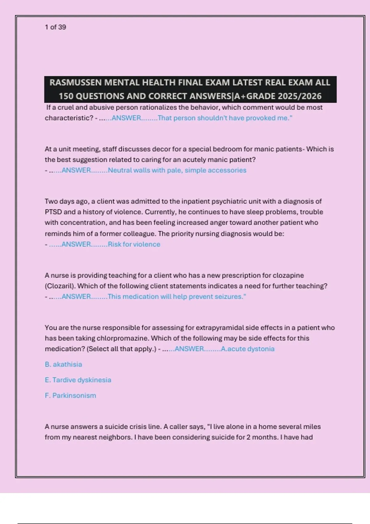 Prepare for the Rasmussen Mental Health Final Exam with this complete study resource featuring all 150 questions and correct answers from the latest real exam. This guide covers key topics including psychiatric disorders, medication side effects, therapeutic communication, nursing interventions, and diagnostic criteria. Ideal for nursing students and mental health professionals seeking to review essential concepts, improve test performance, and achieve an A+ grade. Each answer includes detailed rationales to enhance understanding and clinical application.
