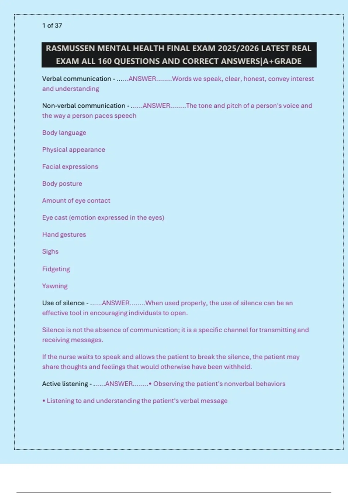 Prepare for the Rasmussen Mental Health Final Exam with this comprehensive study guide featuring all 160 questions and verified correct answers for the 2025/2026 academic year. This resource covers key topics including therapeutic communication, psychiatric medications, defense mechanisms, ethical principles, nursing interventions, and more. Ideal for nursing students reviewing mental health concepts, pharmacology, patient safety, and clinical decision-making. Boost your confidence and ensure an A+ grade with this detailed exam guide.