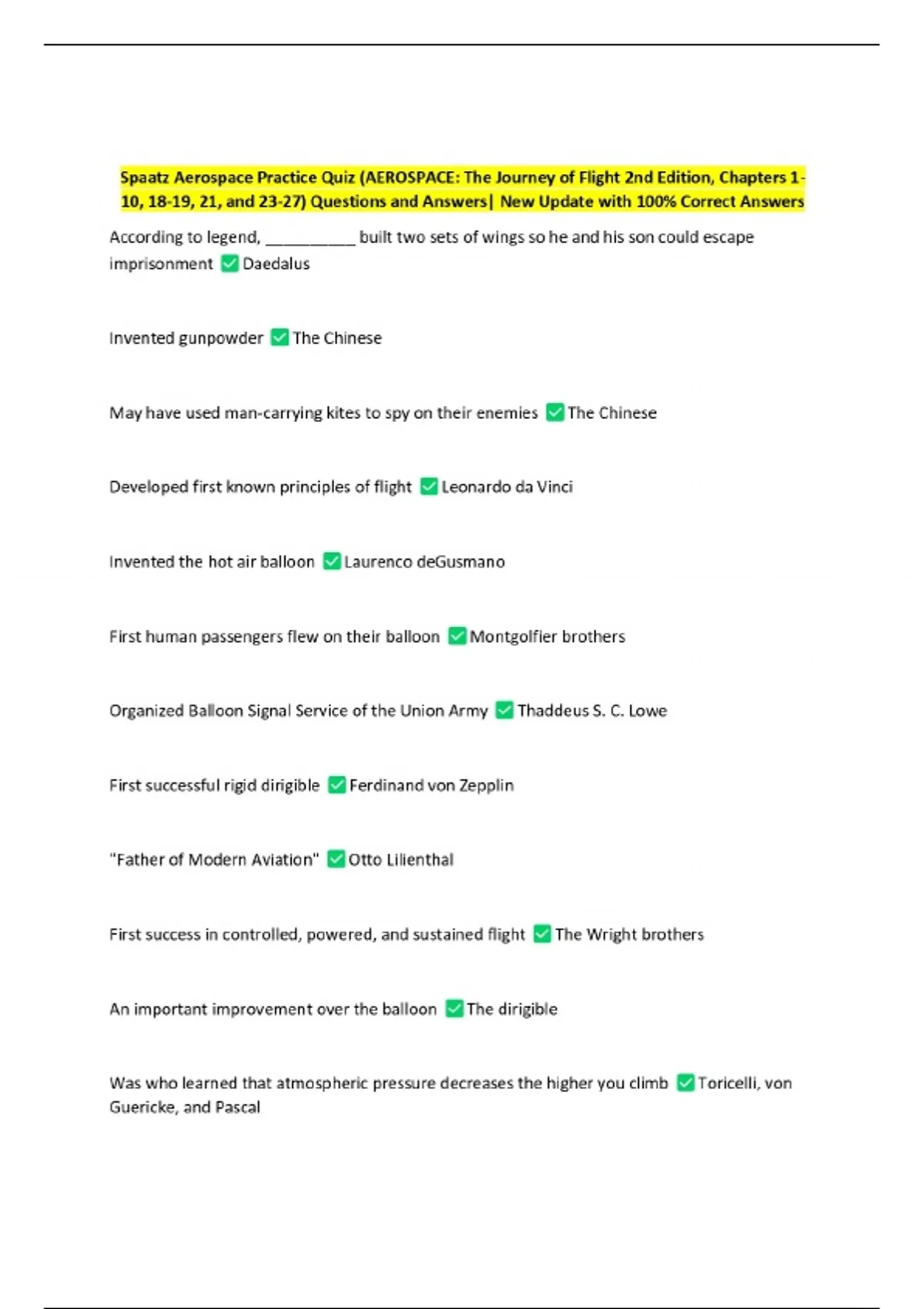 Spaatz Aerospace Practice Quiz (AEROSPACE: The Journey of Flight 2nd Edition, Chapters 1 10, 18-19, 21, and 23-27) Questions and Answers| New Update with 100% Correct Answers