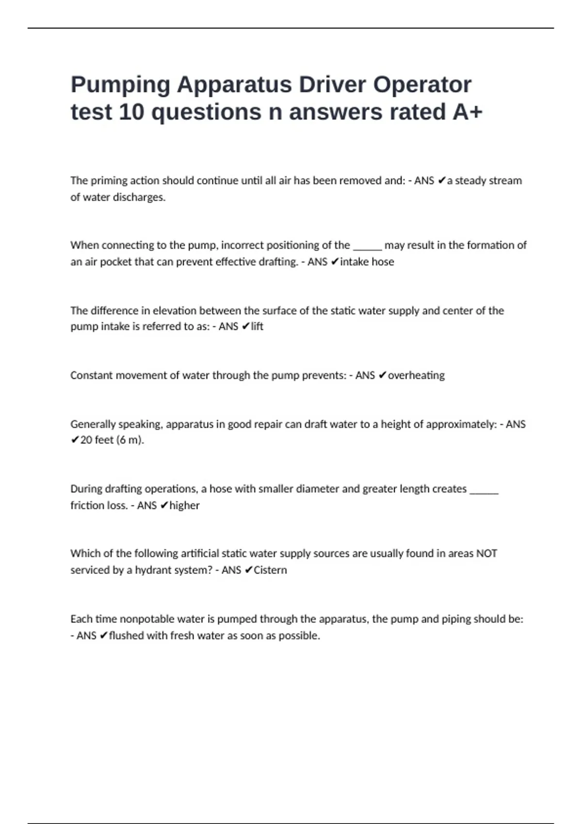 Pumping Apparatus Driver Operator test 10 questions n answers rated A+