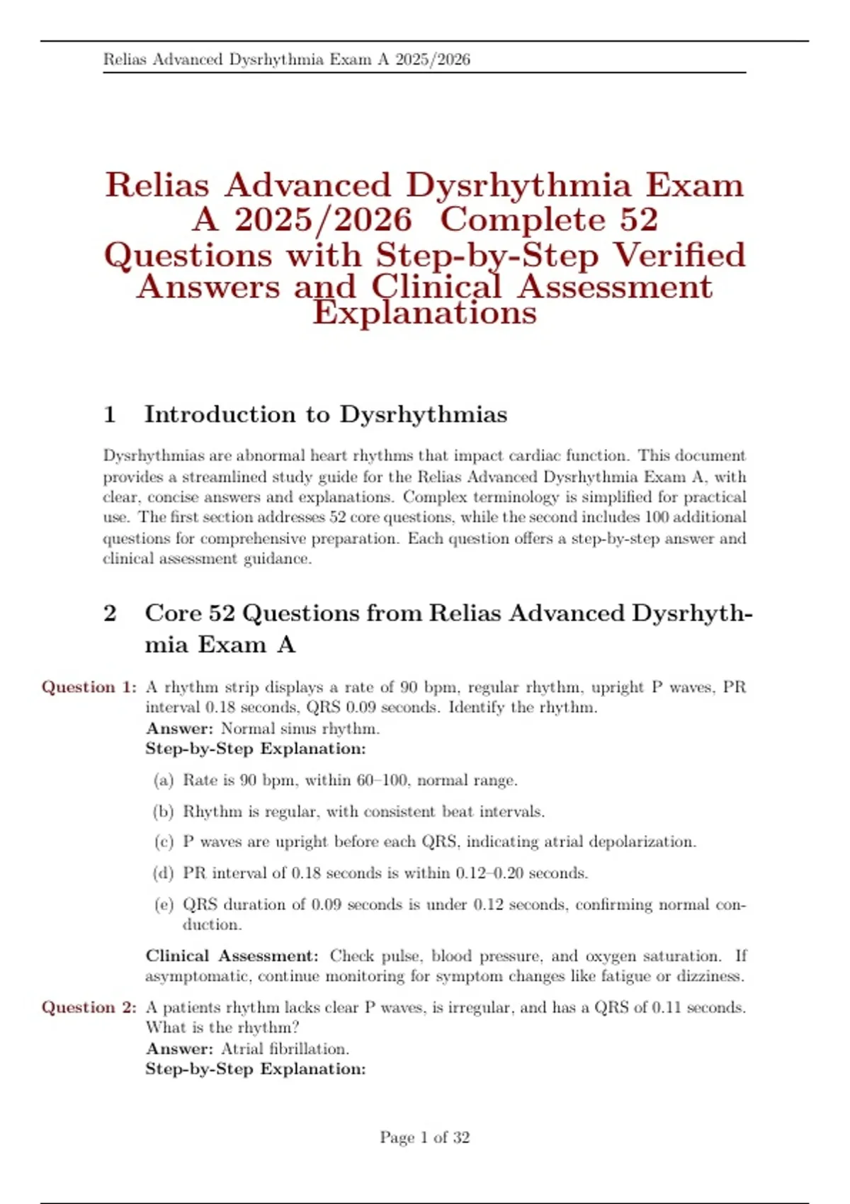 Relias Advanced Dysrhythmia Exam A 2025/2026 Complete 52 Questions with Step-by-Step Verified Answers and Clinical Assessment Explanations 1 Introduction to Dysrhythmias Dysrhythmias are abnormal heart rhythms that impact cardiac function. This document provides a streamlined study guide for the Relias Advanced Dysrhythmia Exam A, with clear, concise answers and explanations. Complex terminology is simplified for practical use. The first section addresses 52 core questions, while the second includes 100 additional questions for comprehensive preparation. Each question offers a step-by-step answer and clinical assessment guidance.