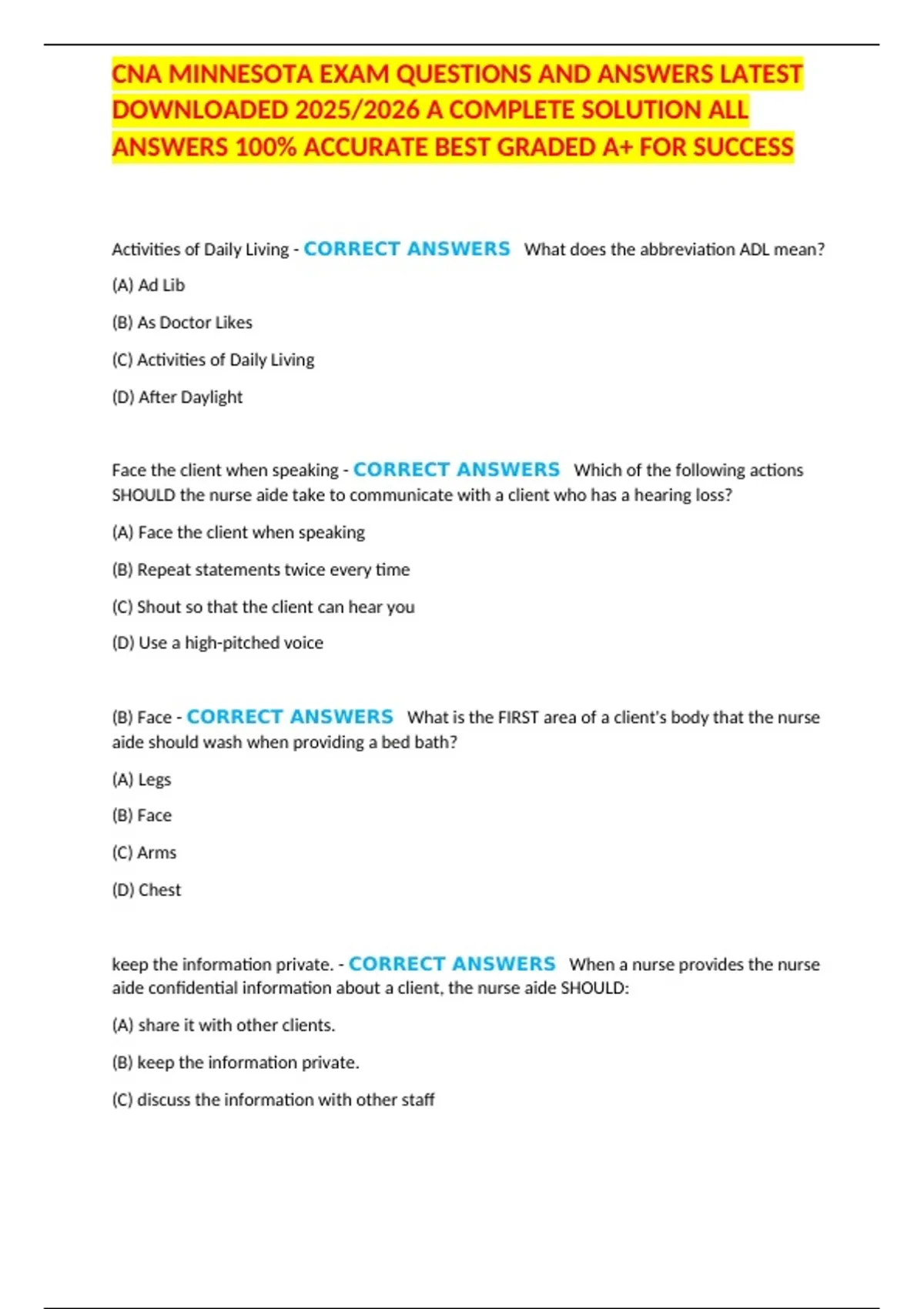, CNA MINNESOTA EXAM QUESTIONS AND ANSWERS LATEST