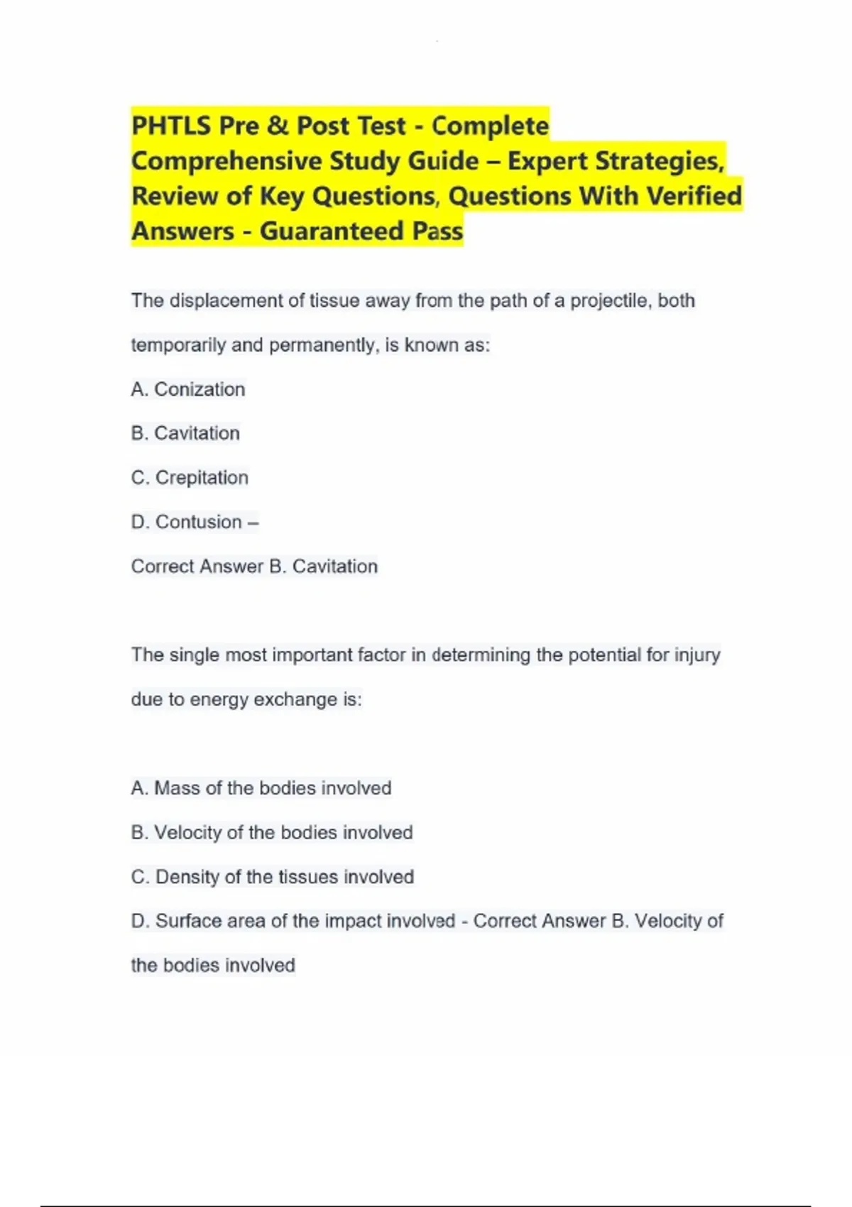 PHTLS Pre & Post Test - Complete Comprehensive Study Guide – Expert Strategies, Review of Key Questions, Questions With Verified Answers - Guaranteed Pass