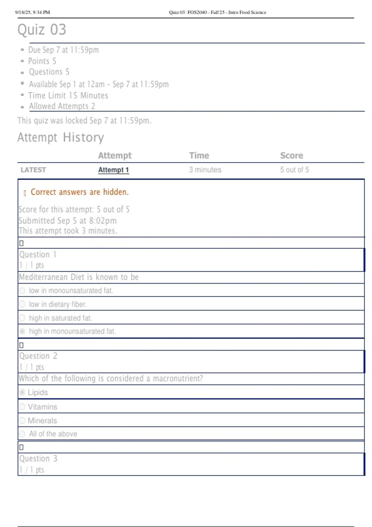 9/18/25, 9:34 PM Quiz 03: FOS2040 - Fall'25 - Intro Food Science