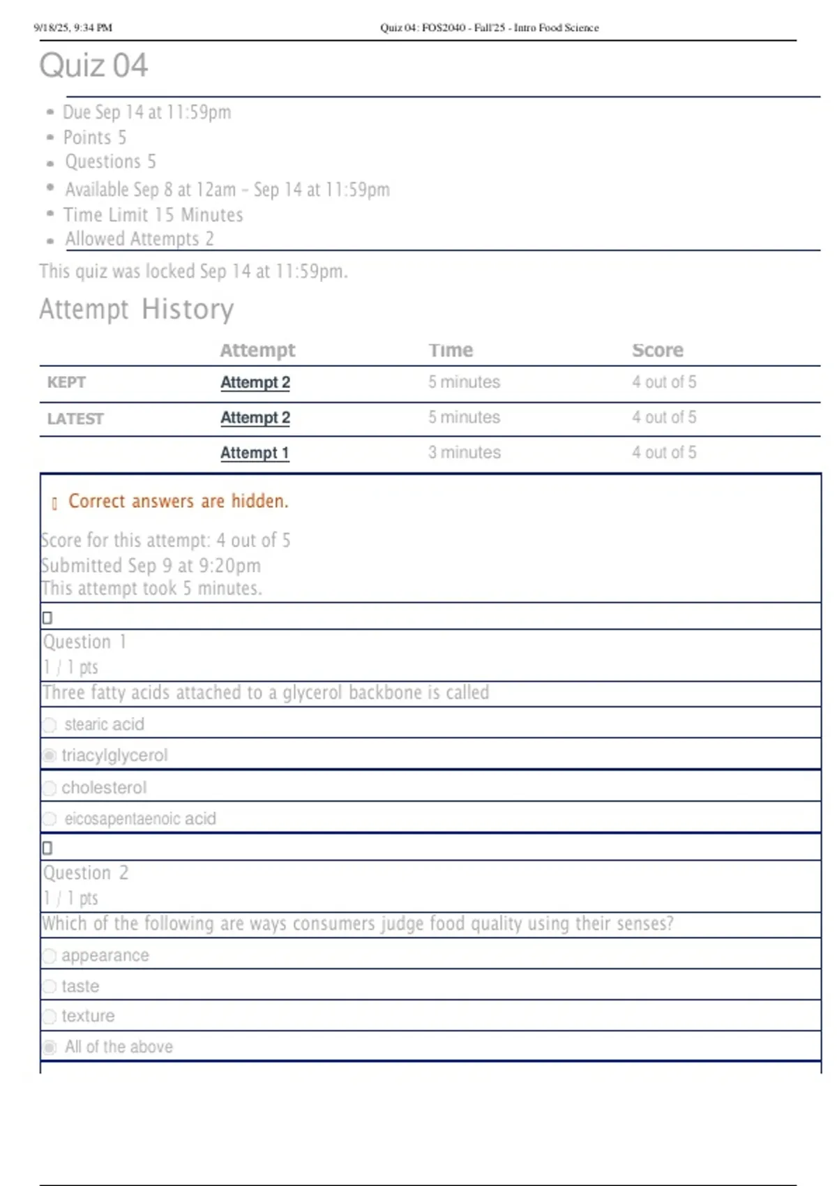 9/18/25, 9:34 PM Quiz 04: FOS2040 - Fall'25 - Intro Food Science