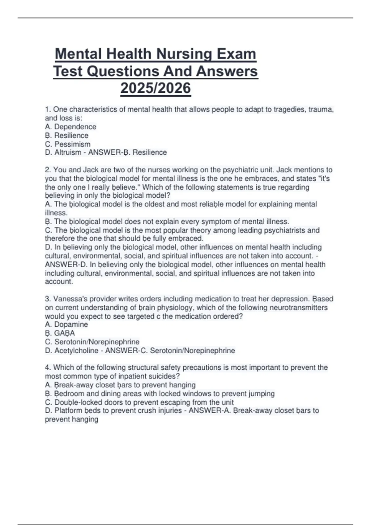 Mental Health Nursing Exam Test Questions And Answers 2025/2026