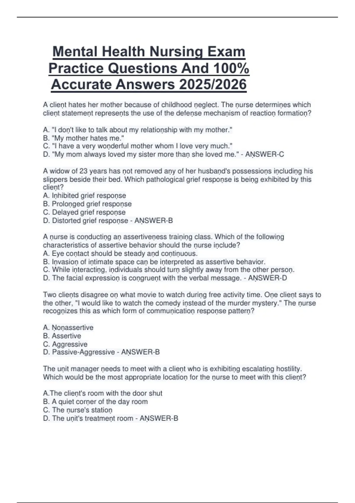 This document features mental health nursing exam practice questions with 100% accurate answers for the 2025/2026 academic year. It covers essential areas including psychiatric disorders, nursing interventions, therapeutic communication, and psychopharmacology. With reliable and precise answers, this resource is ideal for students who want to test their knowledge and prepare effectively for upcoming nursing exams.