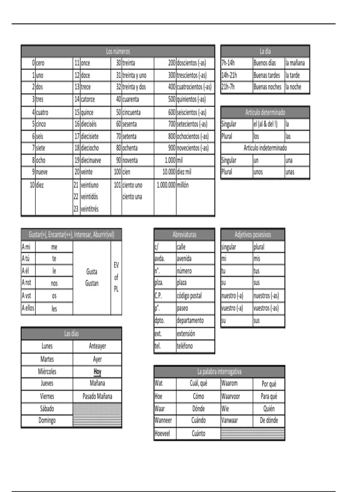0 cero 11 once 30 treinta 200 doscientos (-as) 7h-14h Buenos días la mañana
