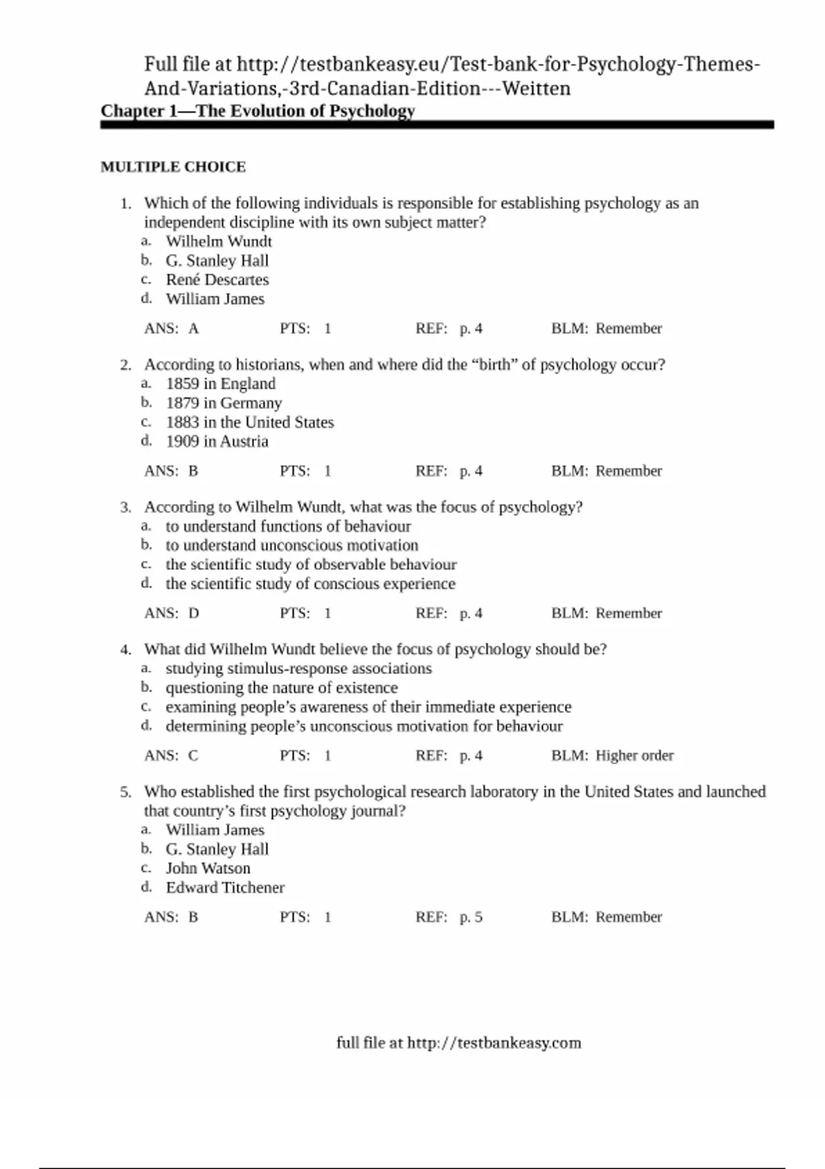 Test bank for psychology themes and variations 3rd Canadian edition weitten
