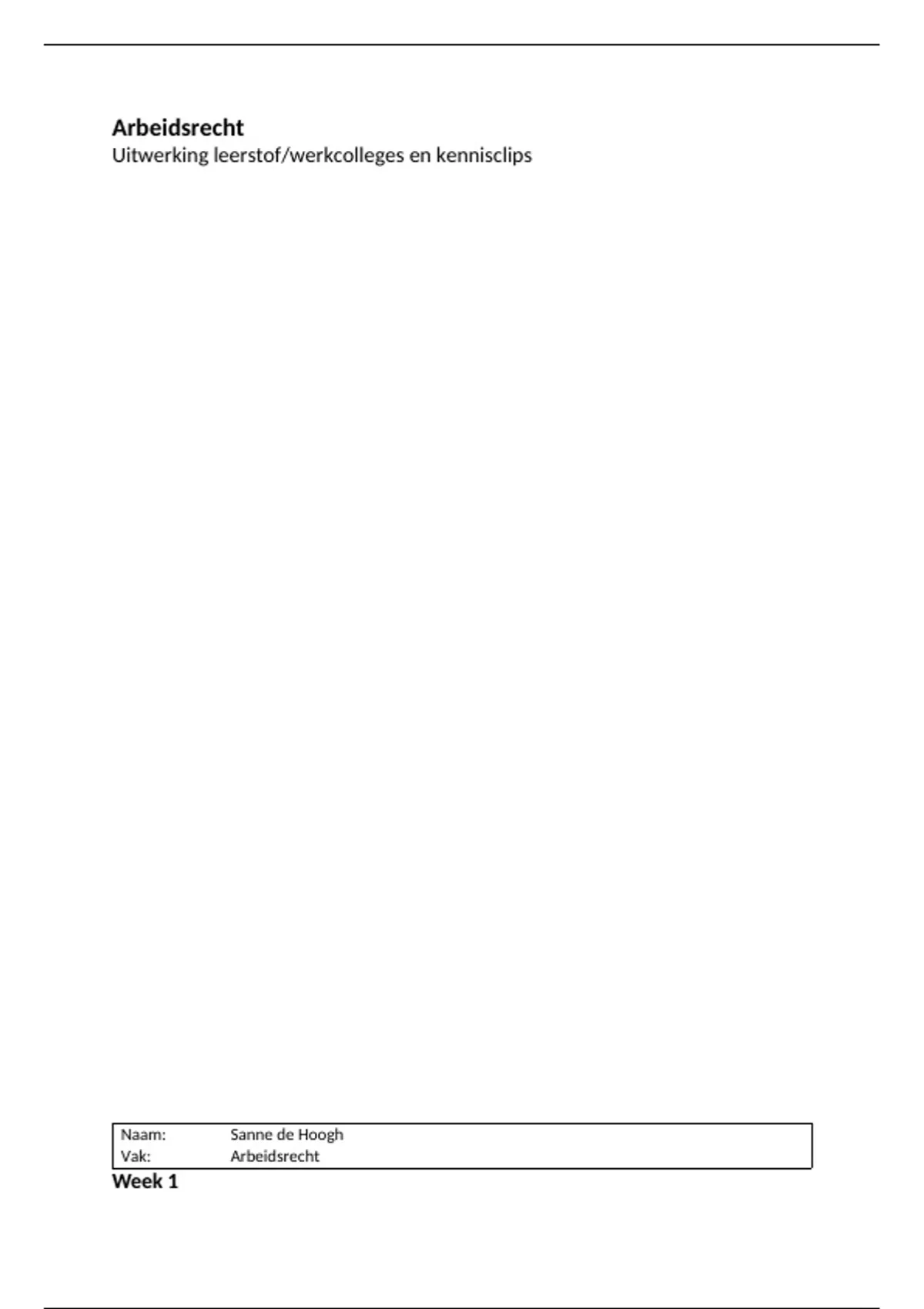 Dit bestand bevat een uitgebreide samenvatting en uitwerking van de leerdoelen over arbeidsrecht aan de Hogeschool Leiden. Het behandelt de kenmerken van de arbeidsovereenkomst en het onderscheid met opdracht- en aannemingsovereenkomsten, evenals flexibele arbeidsrelaties zoals uitzend-, oproep-, detachering- en payrollcontracten. Ook komt de systematiek van het arbeidsrecht aan bod, met dwingend, semidwingend en aanvullend recht en de rol van cao’s. Verder wordt ingegaan op collectieve arbeidsovereenkomsten, stakingsrecht en de rechten en plichten van de ondernemingsraad. Belangrijke thema’s zijn verlofregelingen (BW en WAZO), loondoorbetaling bij ziekte, gelijke behandeling en de verplichtingen van goed werkgeverschap en goed werknemerschap. Daarnaast bespreekt het document aansprakelijkheid van de werkgever bij ongevallen, de toepassing van ontslaggronden binnen het duale stelsel, de ketenregeling en het recht op transitie- en billijke vergoedingen. Zo biedt het een overzicht van de belangrijkste regels, artikelen en beginselen die in de praktijk van het arbeidsrecht van toepassing zijn.