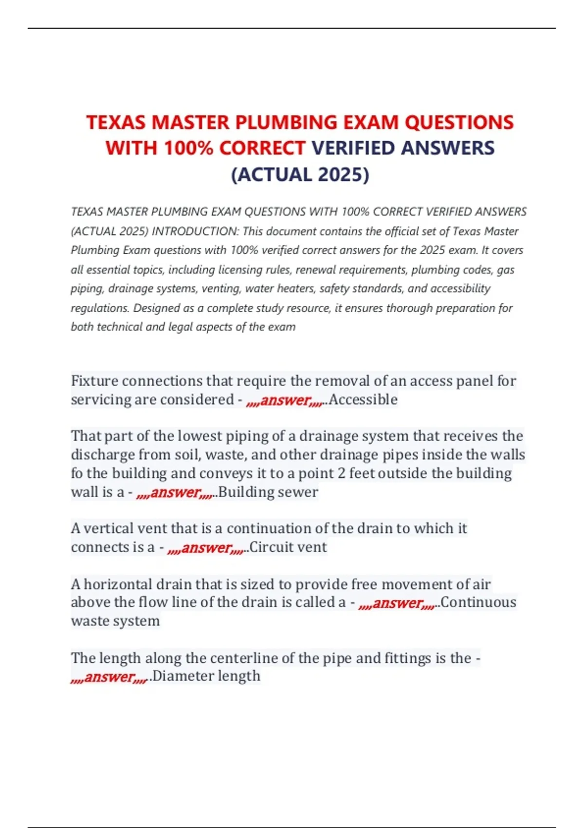 Plumbing Exam questions with 100% verified correct answers for the 2025 exam. It covers