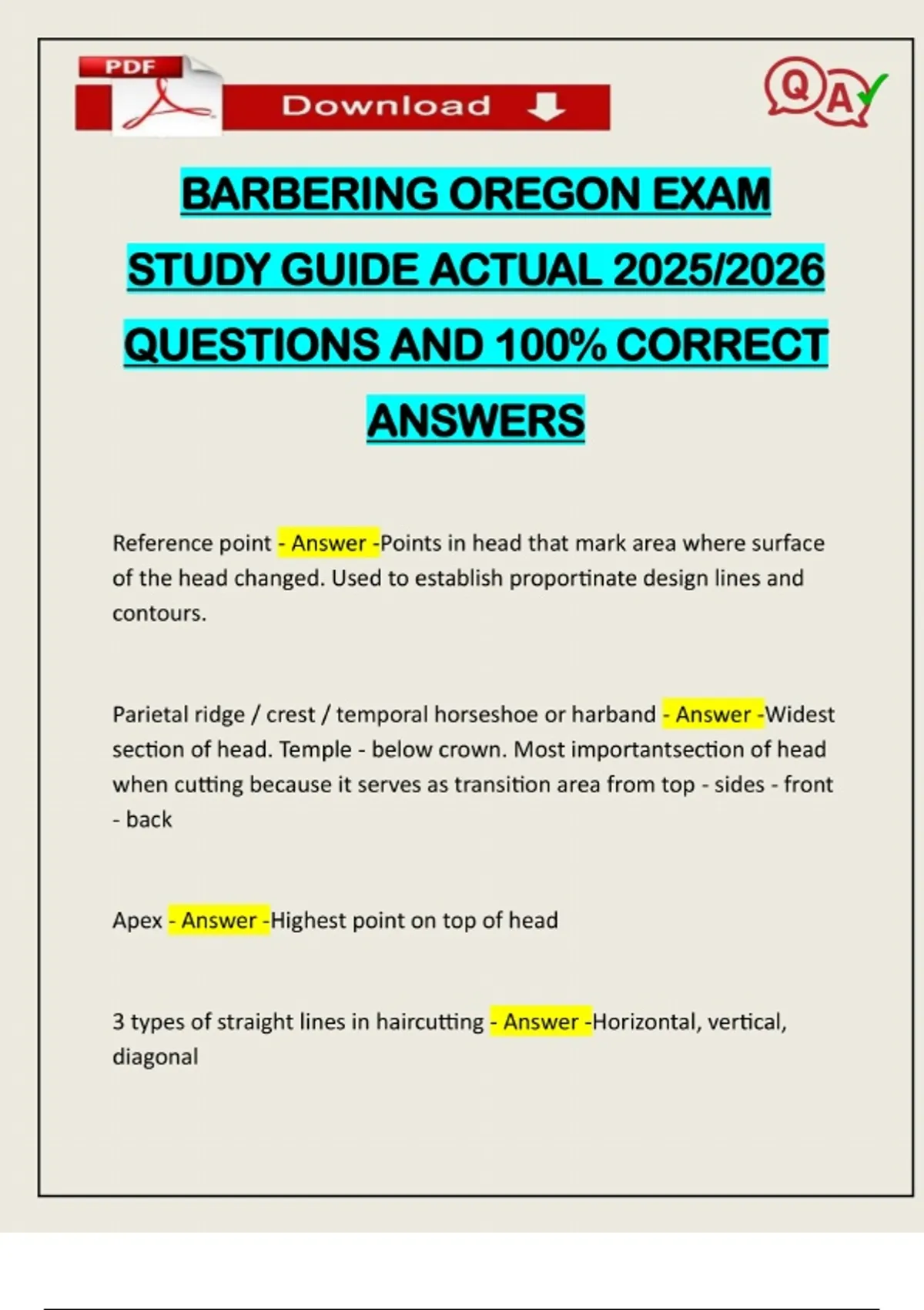 BARBERING OREGON EXAM STUDY GUIDE ACTUAL 2025/2026 QUESTIONS AND 100% CORRECT ANSWERS Reference point - Answer -Points in head that mark area where surface of the head changed. Used to establish proportinate design lines and contours. Parietal ridge / crest / temporal horseshoe or harband - Answer -Widest section of head. Temple - below crown. Most importantsection of head when cutting because it serves as transition area from top - sides - front - back Apex - Answer -Highest point on top of head 3 types of straight lines in haircutting - Answer -Horizontal, vertical, diagonalNeed assistance on Online classes, Exams & Assignments? Reach out for instant help!! Full Course Assistance, Plagiarism-free Essay Writing, Research Paper, Dissertation, Discussion Posts, etc…. Confidential & Secure services. Tutors are available for all subjects! Email now at: Horizontal lines - Answer -Build weight, creat one lenght look, low elevation or blunt cuts. Weightlines are usually created at perineter or occipital area Vertical lines - Answer -Removes weight within tge cut, creates layers. Diagonal lines - Answer -Slanted direction, creating sloped lines @ perimeter, often refered to