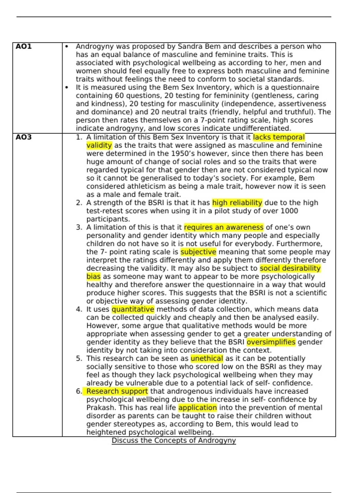 AO3 1. A limitation of this Bem Sex Inventory is that it lacks temporal