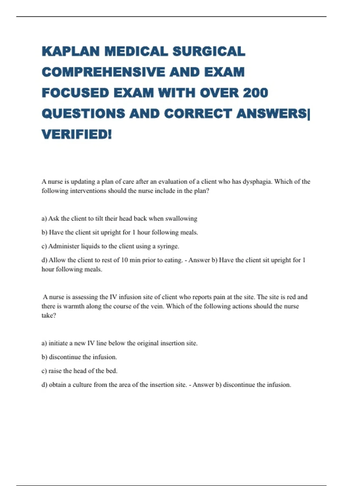 KAPLAN MEDICAL SURGICAL COMPREHENSIVE AND EXAM FOCUSED EXAM WITH OVER 200 QUESTIONS AND CORRECT ANSWERS| VERIFIED!