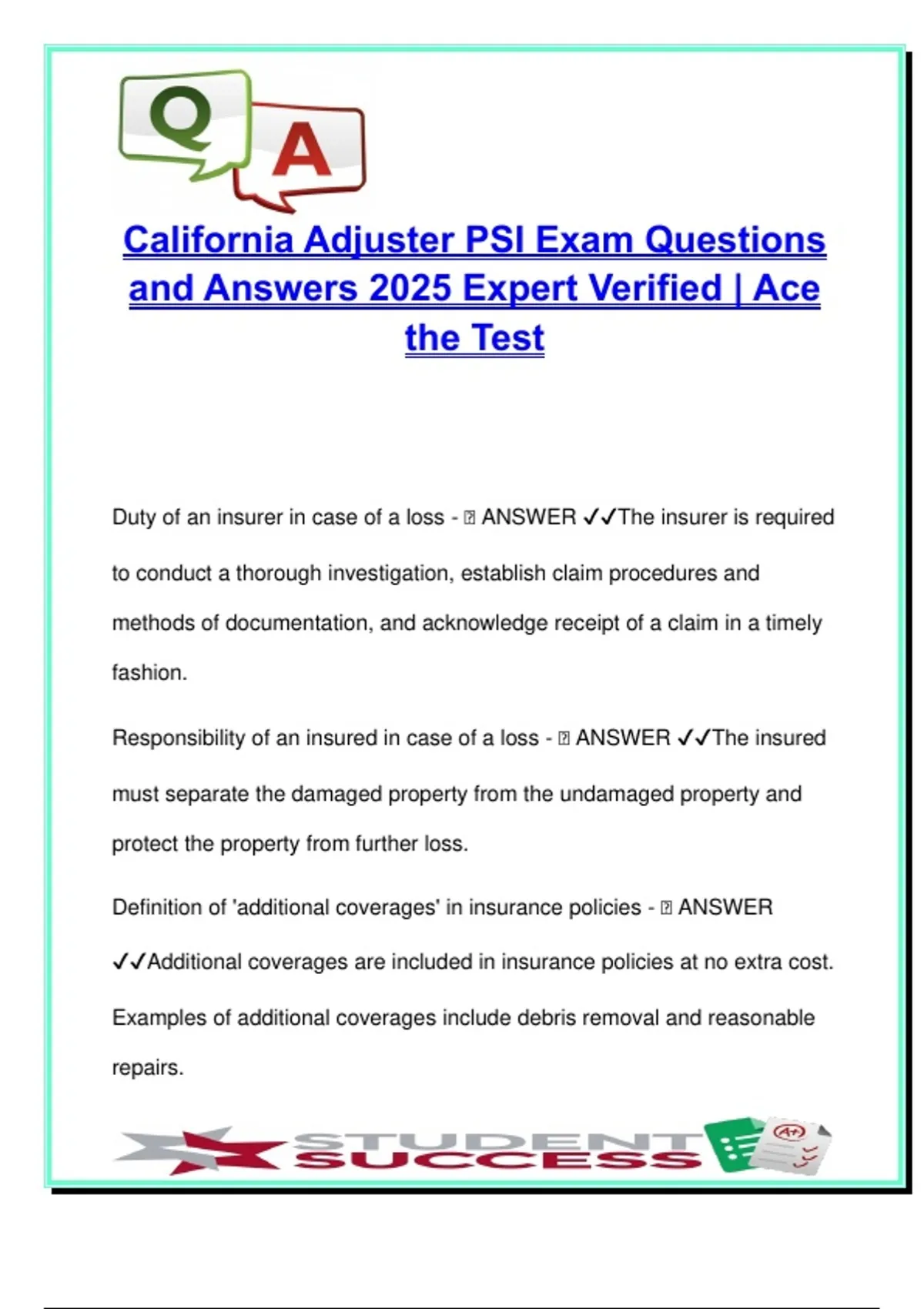 This document contains 50 expert-verified multiple-choice questions and answers specifically tailored for the California Adjuster PSI Exam 2025. It offers an in-depth and up-to-date preparation tool for individuals pursuing their California insurance adjuster license, covering essential knowledge areas required by PSI and the California Department of Insurance. Topics include: Claims handling procedures and both insurer and insured duties after a loss Policy structures and coverages, including Businessowners, Homeowners (HO forms), Commercial Property, Flood Insurance, Umbrella Policies, and Equipment Breakdown Legal terms and regulatory requirements, such as subrogation, salvage, endorsements, structured settlements, and controlled forms Workers’ Compensation rules, medical treatment arrangements, and temporary disability compensation Business Interruption and Consequential Loss Coverage, as well as General Liability, Personal Injury, and Auto Liability Regulatory oversight from the California Insurance Commissioner including licensing, enforcement, and ethics Each question includes a clearly marked correct answer, structured to reinforce comprehension of both technical and practical components of the exam. This resource is ideal for individuals enrolled in or preparing for: Insurance Adjuster Training Programs California Property & Casualty License Courses Pre-licensing classes at vocational schools, community colleges, or insurance institutes Self-study candidates aiming to pass the PSI exam and begin a career in claims adjustment, underwriting, or insurance operations Professionals in property insurance, commercial insurance, liability adjusting, and legal support roles will also find this document highly useful. Keywords: California adjuster exam, PSI insurance test, claims handling, subrogation, business interruption insurance, commercial property, flood insurance, liability coverage, insurance licensing, insurance commissioner, homeowners policy, insurance settlement, structured settlements, property and casualty, adjuster license prep
