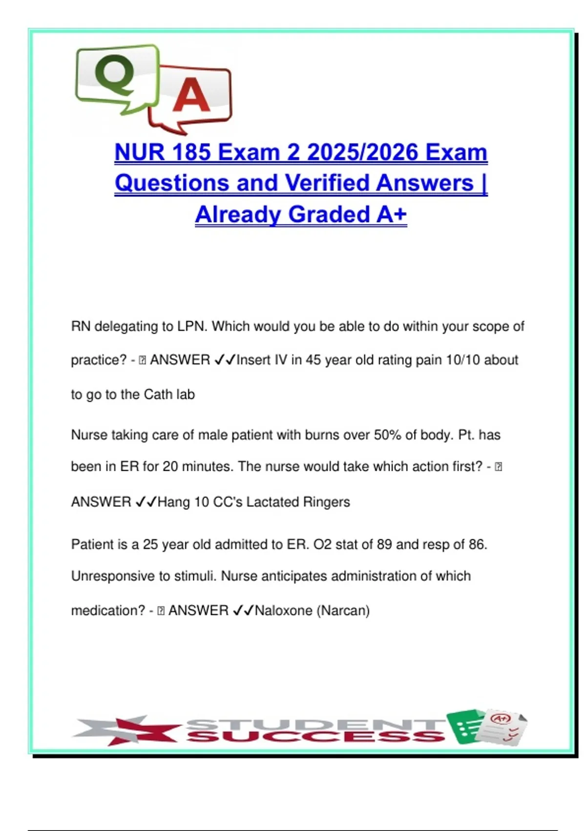 This document offers over 100 well-organized and verified exam questions with correct answers for NUR 185 Exam 2, aligned with the 2025/2026 academic year at Truman State University. It is an essential study resource for nursing students preparing for mid-program assessments in adult care, pharmacology, and nursing fundamentals. Core topics include: – Burn management: fluid resuscitation, topical agents (e.g., mafenide), eschar care, prevention strategies, full-thickness burn characteristics – Mobility & musculoskeletal care: range of motion, immobility risks, assistive devices, contracture prevention, safe transfers – Delegation and nursing roles: scope of practice for RN, LPN, and UAP; safe delegation practices; ethical and legal considerations – Patient safety & fall prevention: bed alarms, commode use, disorientation protocols, home safety assessment – Emergency & disaster response: use of RACE and PASS, fire safety, triage principles – Nutrition & GI care: NG tube checks, enteral feeding readiness, wound healing nutrients like vitamin C – Medication safety & pharmacology: drug effects and patient teaching for Narcan, Sinemet, methotrexate, gentamicin, hydromorphone, tramadol, and propranolol – Elder care & chronic disease: stroke care, disorientation, medication side effects in older adults – Infection prevention & patient hygiene: mucous membrane integrity, oral care, sterile procedures This guide is perfect for: – Nursing students enrolled in Adult Health I, Foundations of Practice, or Pharmacology and Safety courses – Learners preparing for unit exams, ATI, HESI, or NCLEX-RN application-level questions – Nursing professionals seeking a quick-reference review of burn care, delegation, and high-risk clinical scenarios Each Q&A is designed to reflect real clinical logic, safety-first prioritization, and nursing judgment—making this a must-have for exam confidence and professional preparedness. Keywords: NUR 185, burns, fluid resuscitation, delegation, mobility, pharmacology, Narcan, Sinemet, methotrexate, safety, RACE, PASS, fire prevention, NG tube, vitamin C, contractures, full-thickness burn, assistive devices, fall prevention, nurse roles, wound care, Truman State University