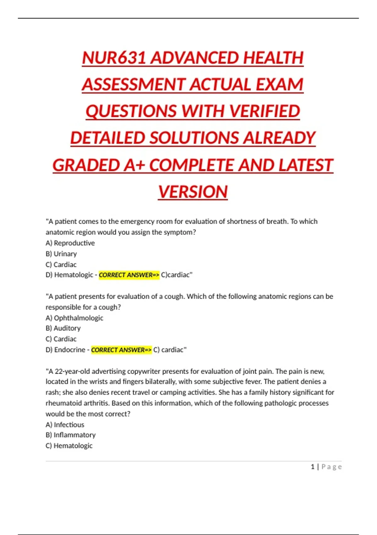NUR631 ADVANCED HEALTH ASSESSMENT ACTUAL EXAM QUESTIONS WITH VERIFIED DETAILED SOLUTIONS ALREADY GRADED A+ COMPLETE AND LATEST VERSION