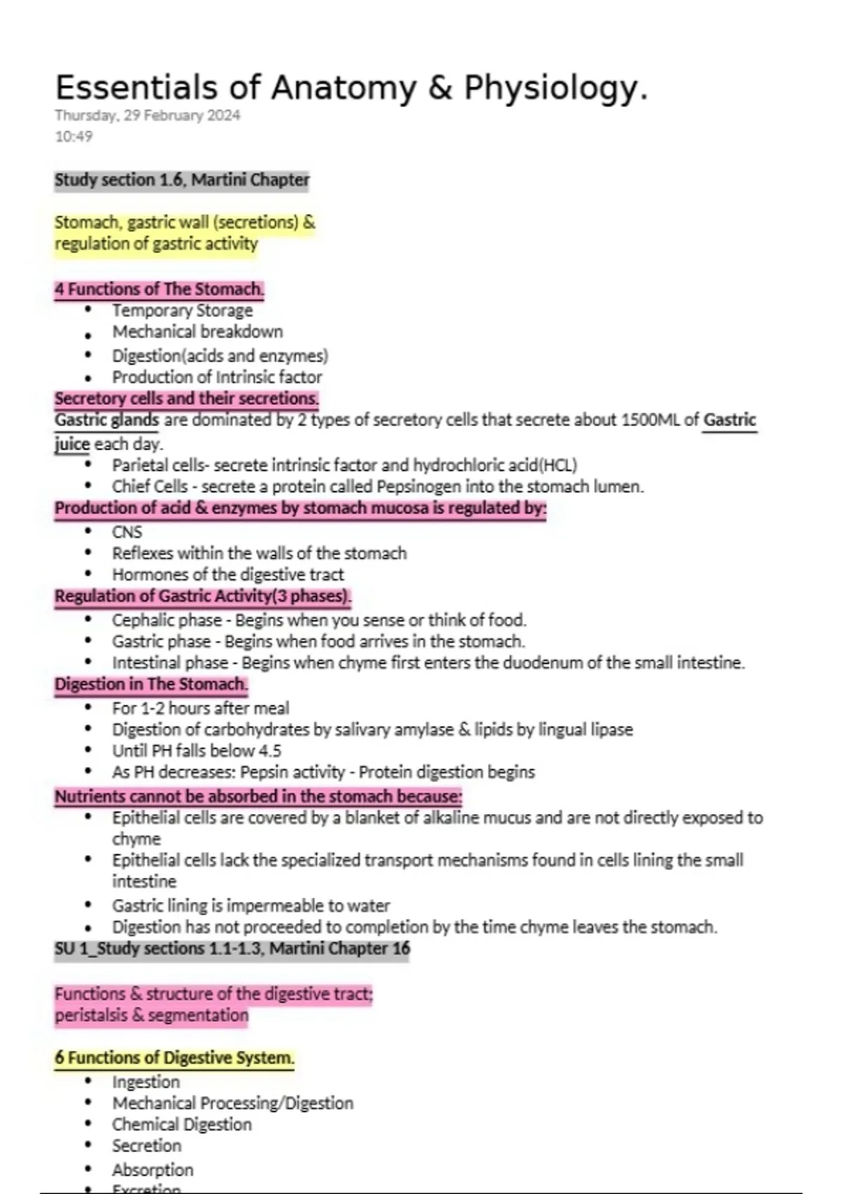 Test Bank For Essentials of Anatomy and Physiology (NOTES) by Frederic H. Martini. LATEST UPDATED VERSION Stomach, gastric wall (secretions) & regulation of gastric activity 4 Functions of The Stomach. Temporary Storage  Mechanical breakdown Digestion(acids and enzymes)  Production of Intrinsic factor Secretory cells and their secretions. Gastric glandsare dominated by 2 types of secretory cells that secrete about 1500ML of Gastric juiceeach day. Parietal cells- secrete intrinsic factor and hydrochloric acid(HCL) Chief Cells - secrete a protein called Pepsinogen into the stomach lumen. Production of acid & enzymes by stomach mucosa is regulated by: CNS Reflexes within the walls of the stomach Hormones of the digestive tract Regulation of Gastric Activity(3 phases). Cephalic phase - Begins when you sense or think of food. Gastric phase - Begins when food arrives in the stomach. Intestinal phase - Begins when chyme first enters the duodenum of the small intestine. Digestion in The Stomach. For 1-2 hours after meal Digestion of carbohydrates by salivary amylase & lipids by lingual lipase Until PH falls below 4.5 As PH decreases: Pepsin activity - Protein digestion begins Nutrients cannot be absorbed in the stomach because: Epithelial cells are covered by a blanket of alkaline mucus and are not directly exposed to chyme Epithelial cells lack the specialized transport mechanisms found in cells lining the small intestine Gastric lining is impermeable to water  Digestion has not proceeded to completion by the time chyme leaves the stomach. SU 1_Study sections 1.1-1.3, Martini Chapter 16 Functions & structure of the digestive tract; peristalsis & segmentation 6 Functions of Digestive System. Ingestion Mechanical Processing/Digestion Chemical Digestion Secretion Absorption Excretion