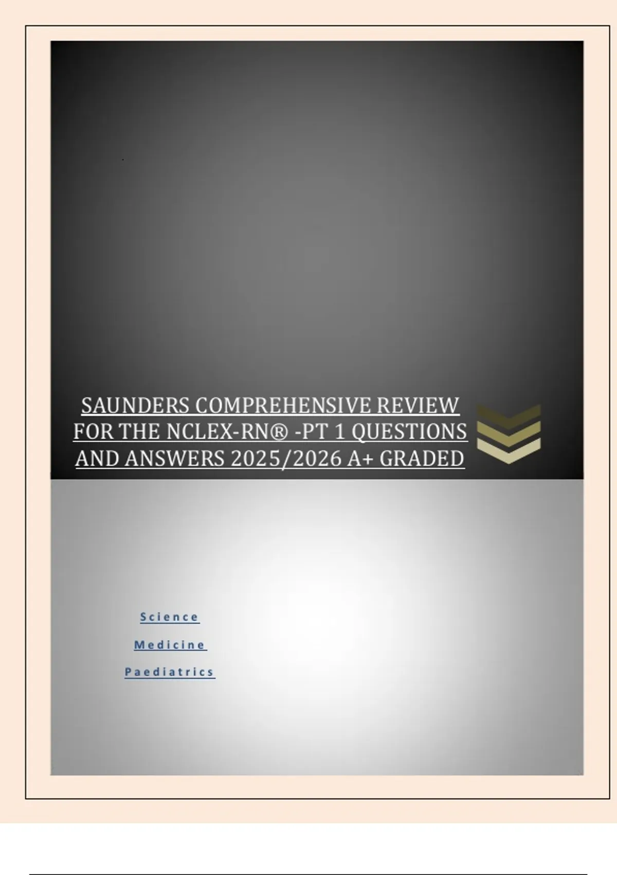 SAUNDERS COMPREHENSIVE REVIEW FOR THE NCLEX-RN® -PT 1 QUESTIONS AND ANSWERS 2025/2026 A+ GRADED The nurse is caring for an infant with a diagnosis of hydrocephalus and is monitoring the infant for signs of increased intracranial pressure (ICP). The nurse suspects increased ICP if which of the following is noted? 1. Proteinuria 2. Bradycardia 3. A drop in blood pressure 4. A bulging anterior fontanel *hydrocephalus :A build-up of fluid in the cavities deep within the brain.This causes increased intracranial pressure. - Correct Answer-4 Rationale: An elevated or bulging anterior fontanel indicates an increase in cerebrospinal fluid collection in the cerebral ventricle. The nurse is caring for a child who has sustained a head injury in an automobile accident and is monitoring the child for signs of increased intracranial pressure (ICP). The nurse monitors for the earliest sign of increased ICP by assessing for: 1. Apnea 2. Posturing 3. Tachycardia 4. Changes in level of consciousness (LOC)