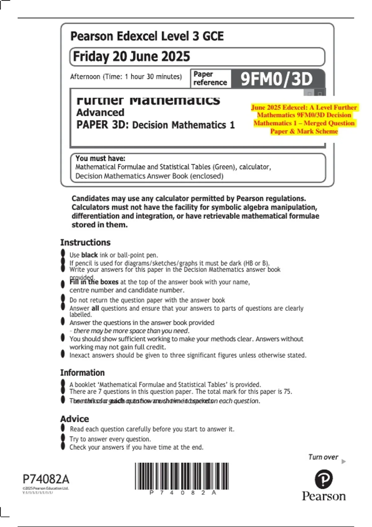 Advanced Mathematics 9FM0/3D Decision