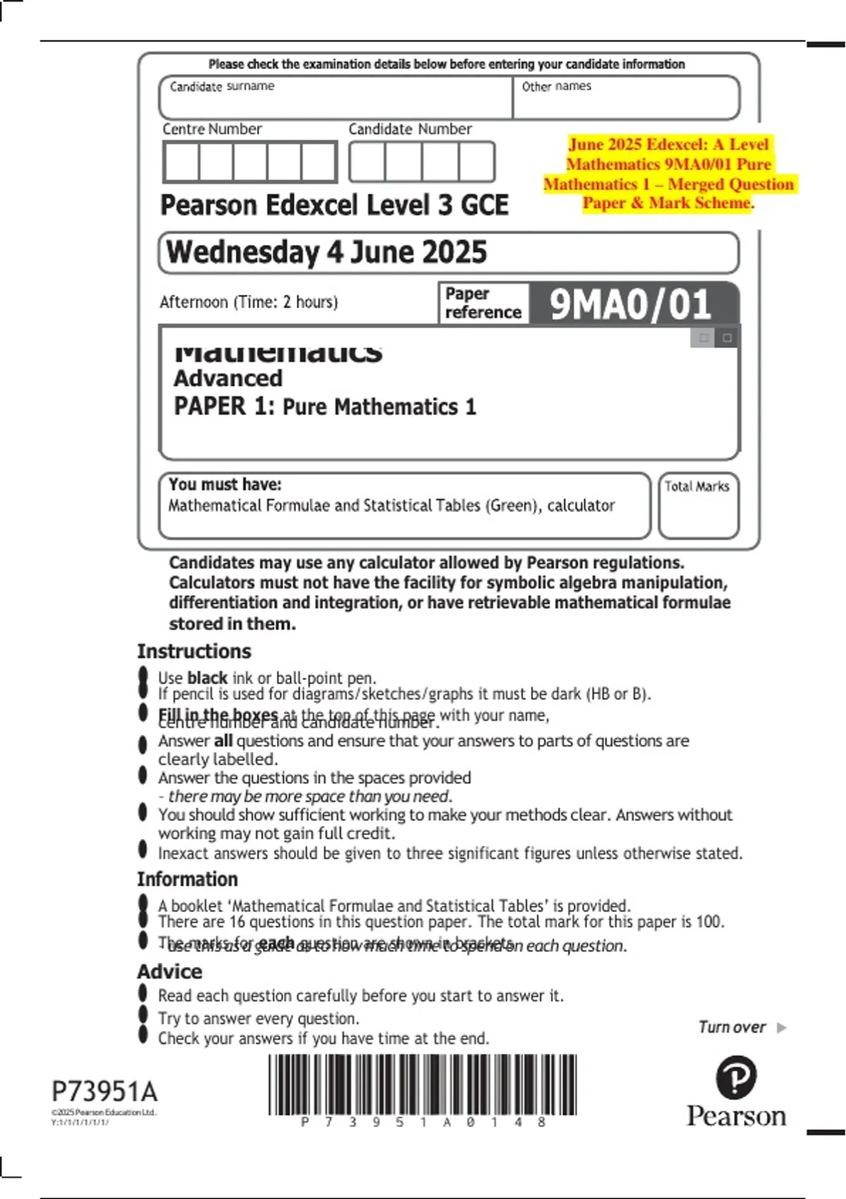 Candidates may use any calculator allowed by Pearson regulations.