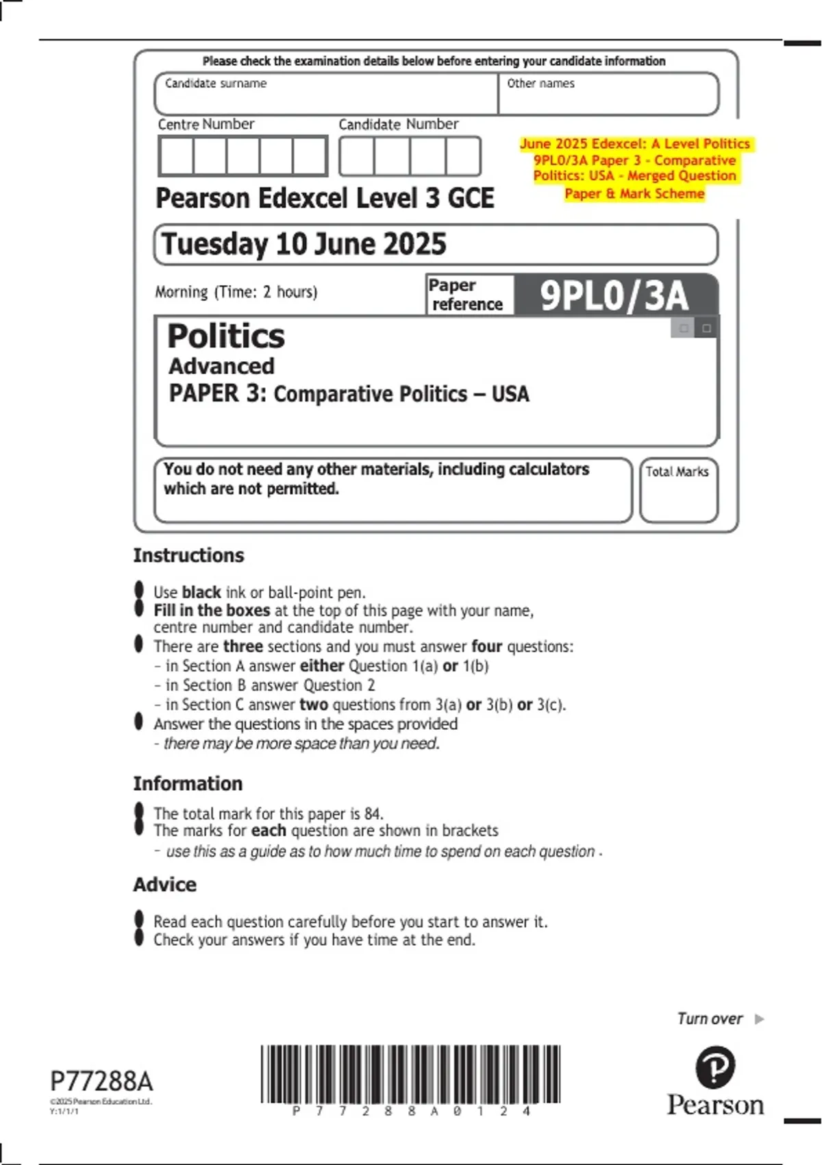 June 2025 Edexcel: A Level Politics 9PL0/3A Paper