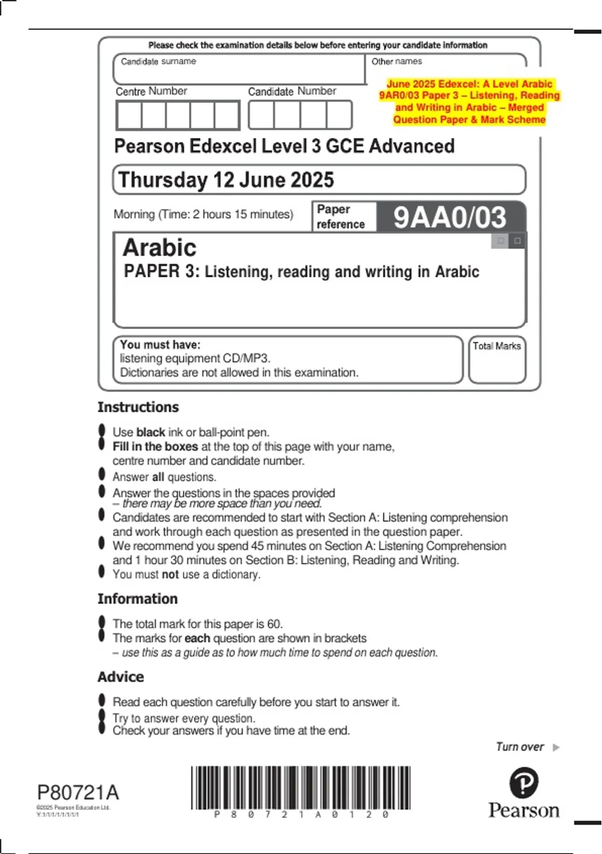 Number Number 9AR0/03 Paper 3 – Listening, Reading