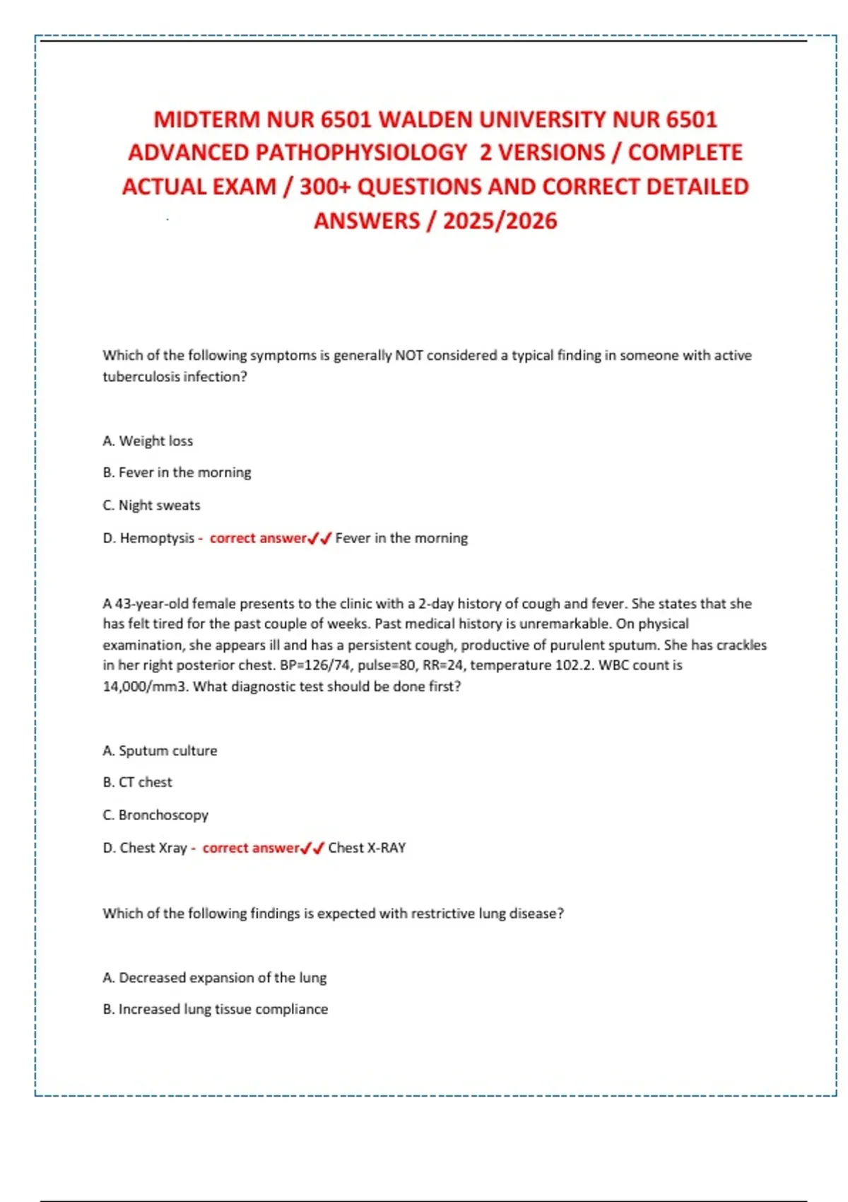 D. Hemoptysis - correct answer✔✔ Fever in the morning