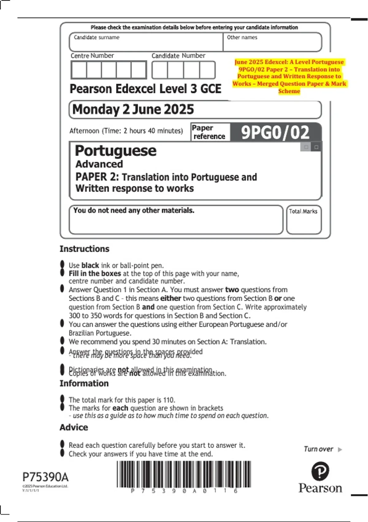 June 2025 Edexcel: A Level Portuguese 9PGO/02 Paper 2 – Translation into Portuguese and Written Response to Works – Merged Question Paper & Mark Scheme