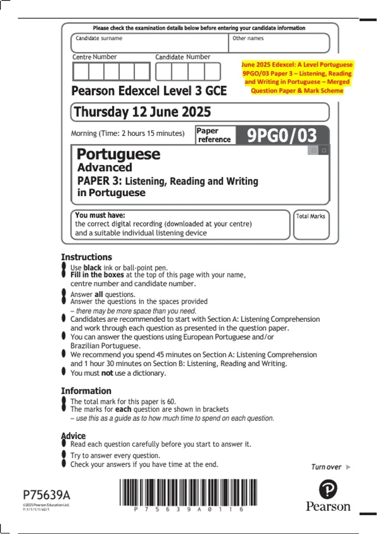and 1 hour 30 minutes on Section B: Listening, Reading and Writing.