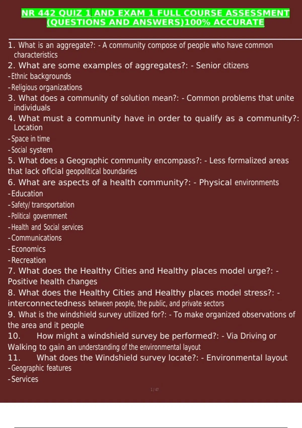 , NR 442 QUIZ 1 AND EXAM 1 FULL COURSE ASSESSMENT