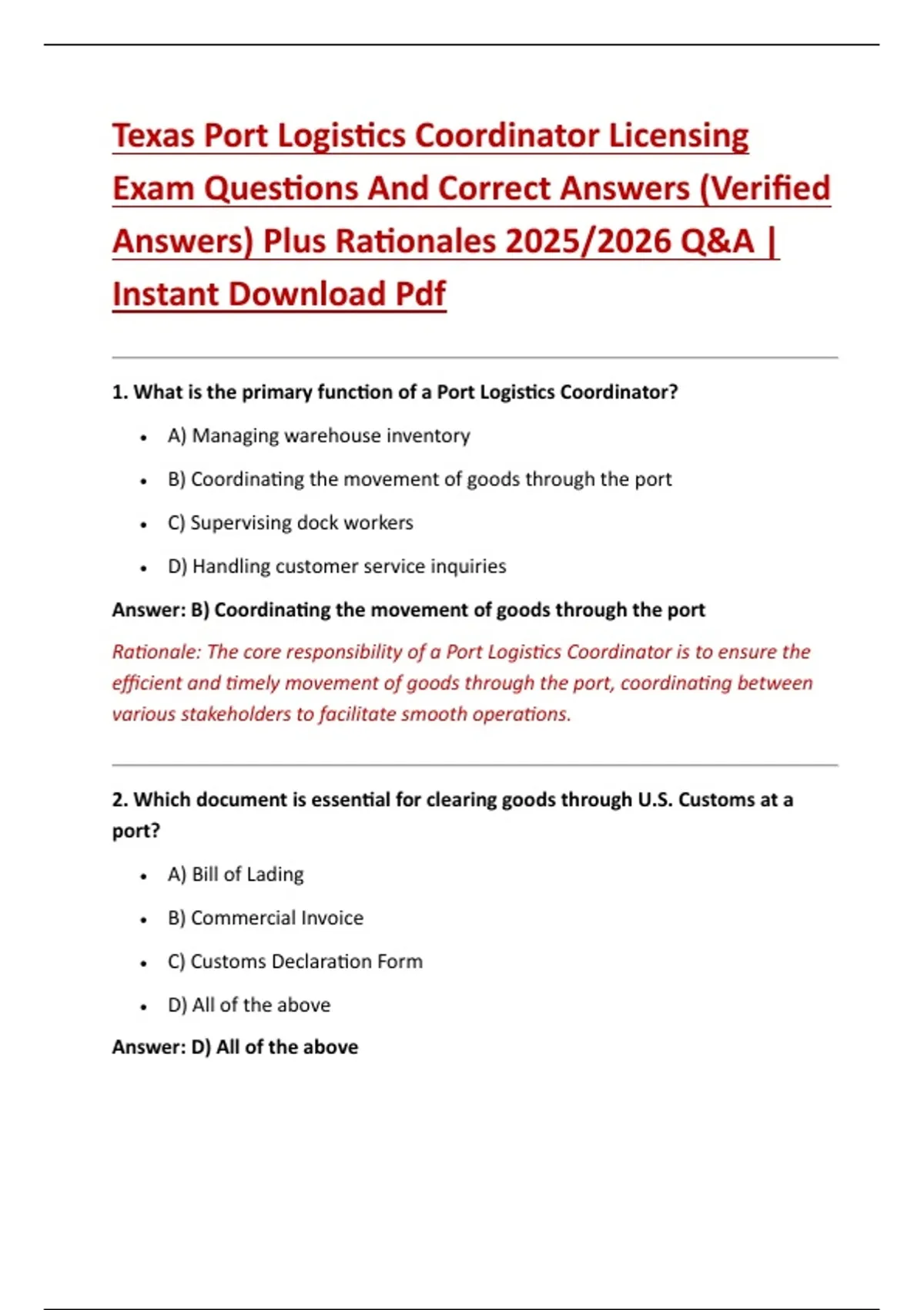 Texas Port Logistics Coordinator Licensing Exam Questions And Correct Answers (Verified Answers) Plus Rationales 2025/2026 Q&A | Instant Download Pdf