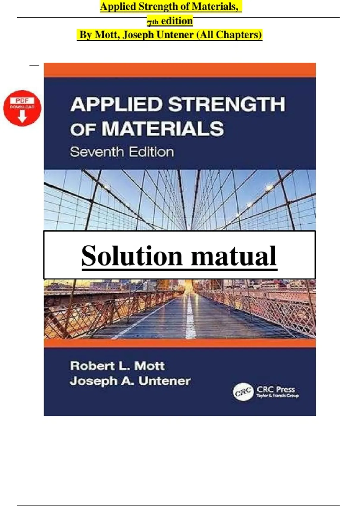 This solution manual provides detailed, step-by-step answers to all chapters from Applied Strength of Materials (7th Edition) by Robert L. Mott and Joseph A. Untener. It covers essential topics such as stress and strain, axial loading, torsion, bending, transverse shear, combined stresses, deflection, buckling, and fatigue. Each solution is clearly explained and aligned with the textbook’s problem sets, making it a comprehensive study and practice resource for engineering students.