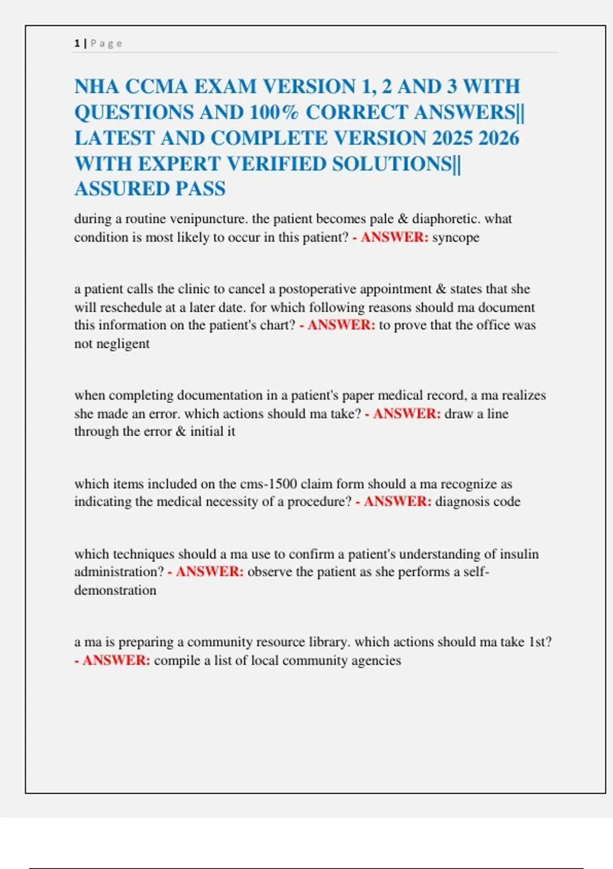 NHA CCMA EXAM VERSION 1, 2 AND 3 WITH QUESTIONS AND 100% CORRECT ANSWERS|| LATEST AND COMPLETE VERSION WITH EXPERT VERIFIED SOLUTIONS|| ASSURED PASS