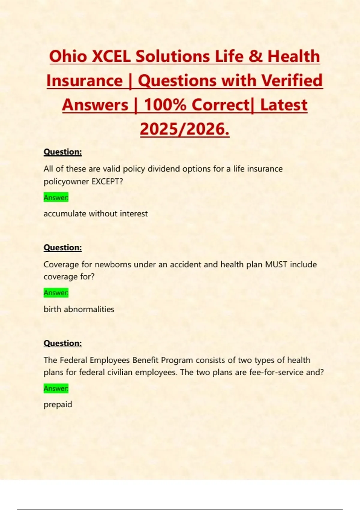 Ohio XCEL Solutions Life & Health Insurance | Questions with Verified Answers | 100% Correct| Latest 2025/2026. Ohio XCEL Solutions Life & Health Insurance | Questions with Verified Answers | 100% Correct| Latest 2025/2026.