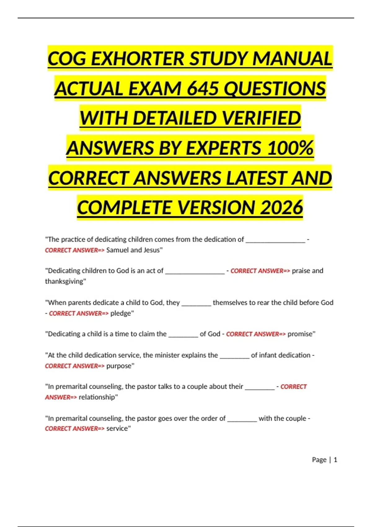 COG EXHORTER STUDY MANUAL ACTUAL EXAM 645 QUESTIONS WITH DETAILED VERIFIED ANSWERS BY EXPERTS 100% CORRECT ANSWERS LATEST AND COMPLETE VERSION 2026