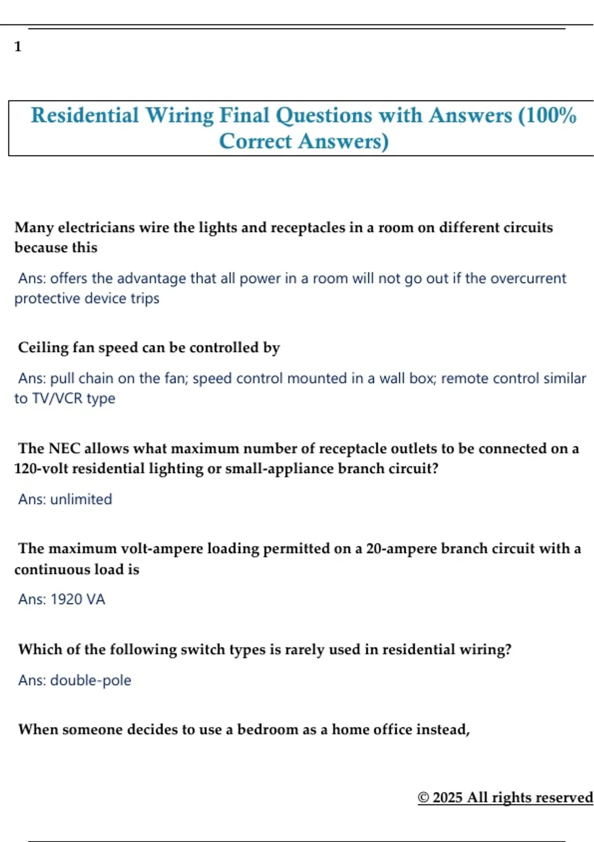 Residential Wiring Final Questions with Answers (100% Correct Answers) Residential Wiring Final Questions with Answers (100% Correct Answers)