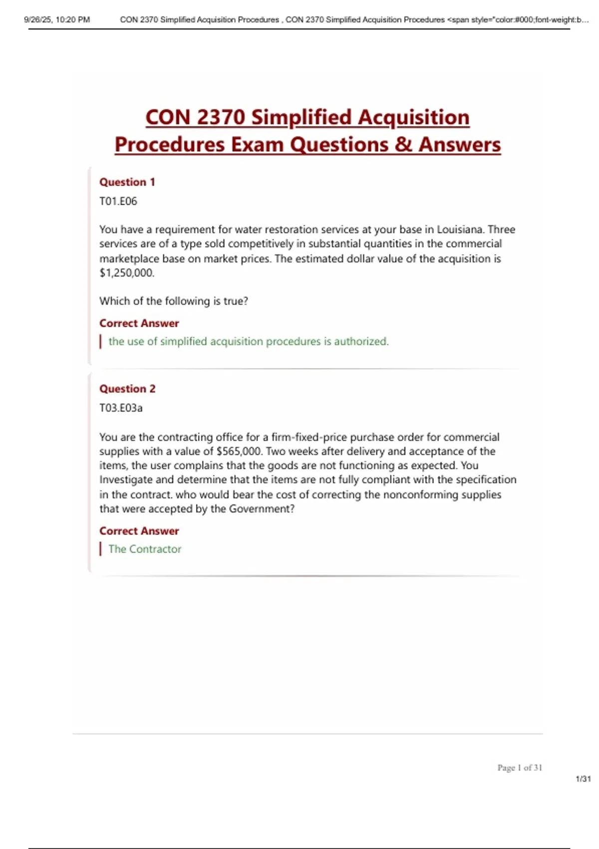 CON 2370 Simplified Acquisition Procedures Exam Questions & Answers