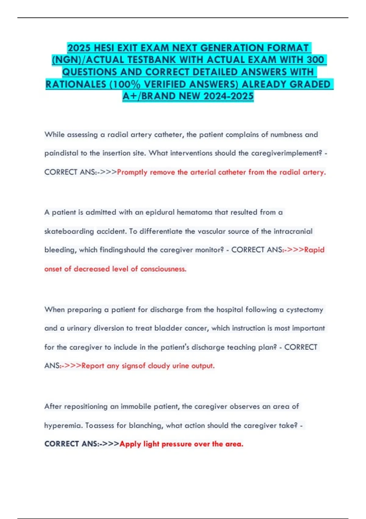 This document contains the latest HESI Exit Exam Next Generation (NGN) test bank for 2023–2025, featuring 300 actual exam-style questions. Each question includes 100% verified correct answers and detailed rationales. Topics cover medical-surgical nursing, pharmacology, maternal-newborn, pediatrics, psychiatric nursing, delegation, prioritization, and safety. Designed to reflect the newest NGN format, this A+ graded resource provides comprehensive preparation for nursing students preparing for the HESI Exit Exam.
