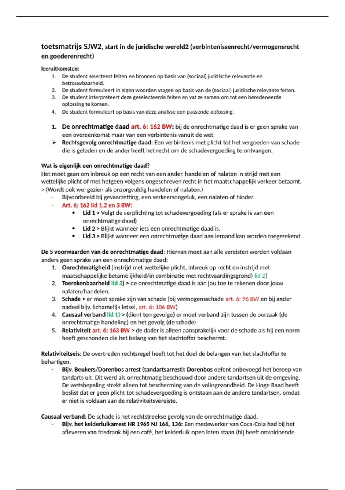 toetsmatrijs SJW2, start in de juridische wereld2 (verbintenissenrecht/vermogensrecht