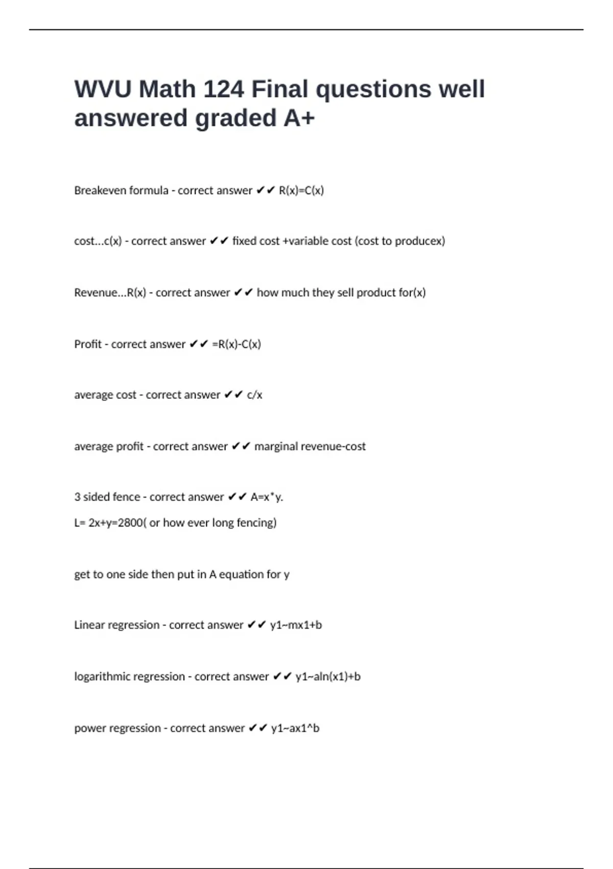 Breakeven formula - correct answer ✔✔ R(x)=C(x)