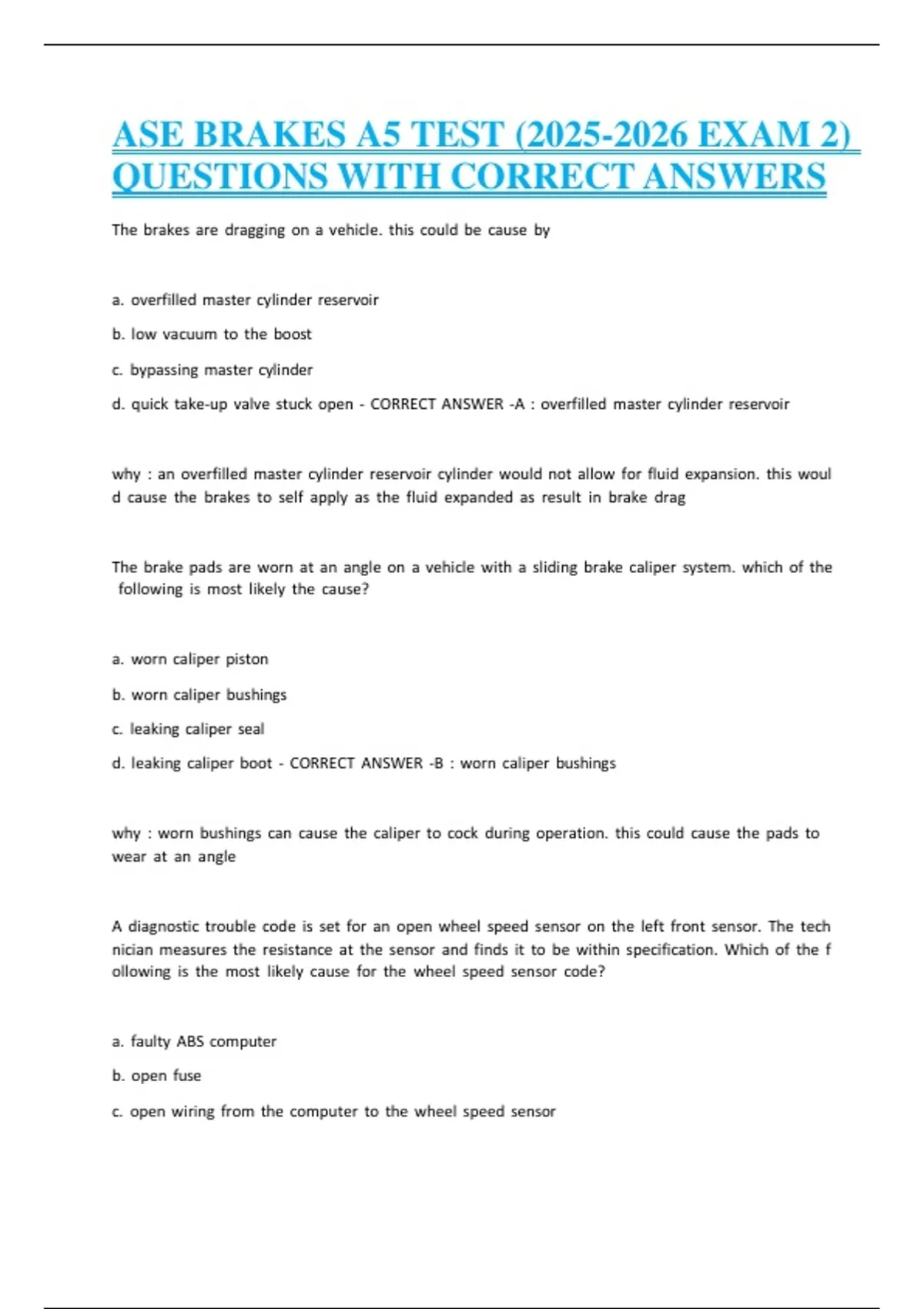 ASE BRAKES A5 TEST ( EXAM 2) QUESTIONS WITH CORRECT ANSWERS ASE BRAKES A5 TEST ( EXAM 2) QUESTIONS WITH CORRECT ANSWERS