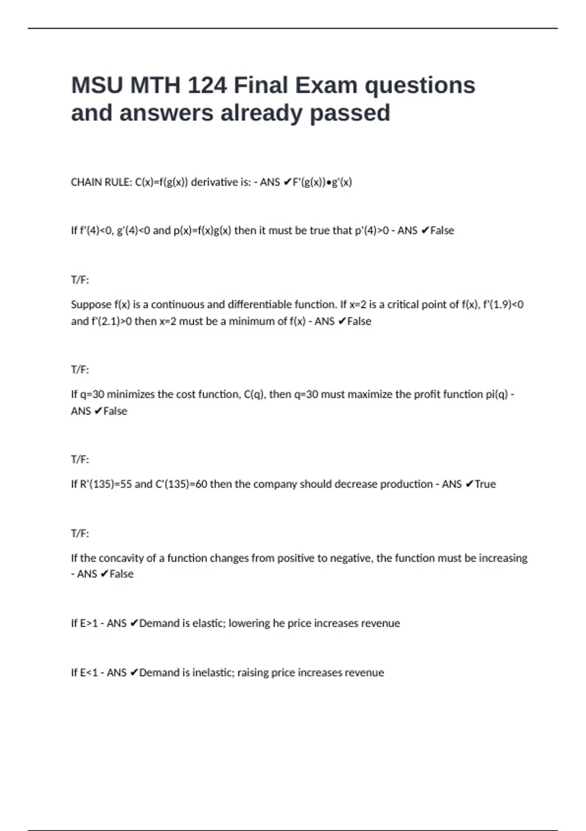 If R'(135)=55 and C'(135)=60 then the company should decrease production - ANS ✔True