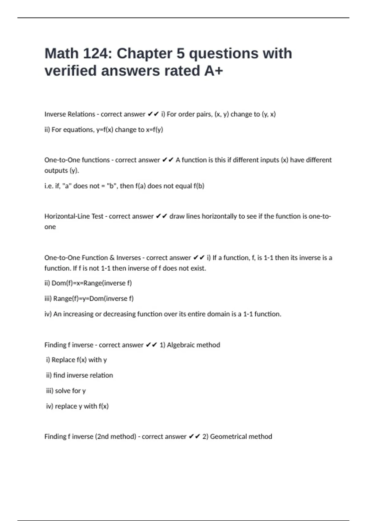 One-to-One Function & Inverses - correct answer ✔✔ i) If a function, f, is 1-1 then its inverse is a