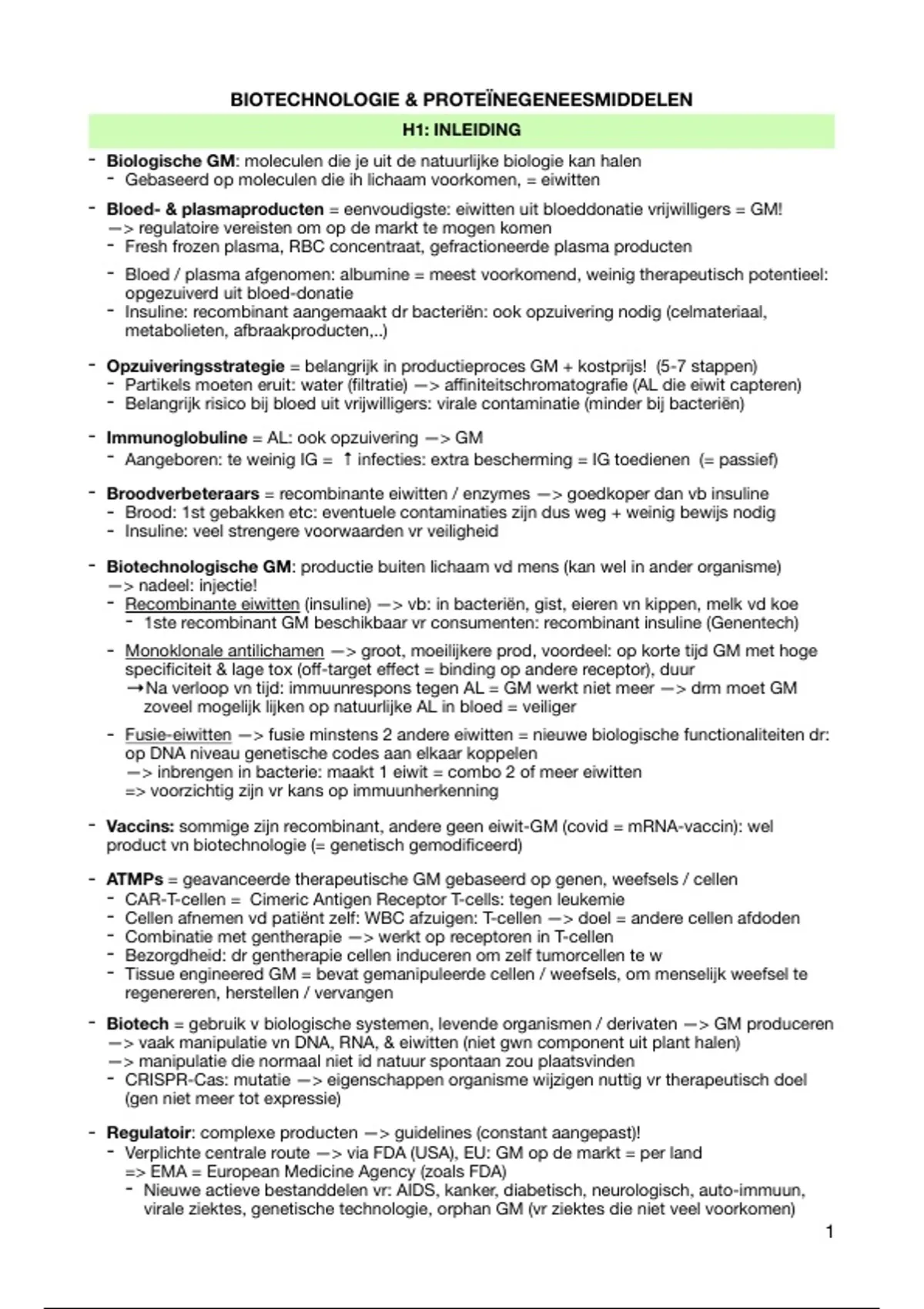 GESLAAGD IN 1E ZIT - Samenvatting Biotechnologie en proteïnegeneesmiddelen - ALLE (chaotische) info die de prof in de les uitlegt is in dit document zeer overzichtelijk uitgeschreven zodat het makkelijk en vlot te studeren is! Met dit document heb je alle info die je nodig hebt om te slagen!