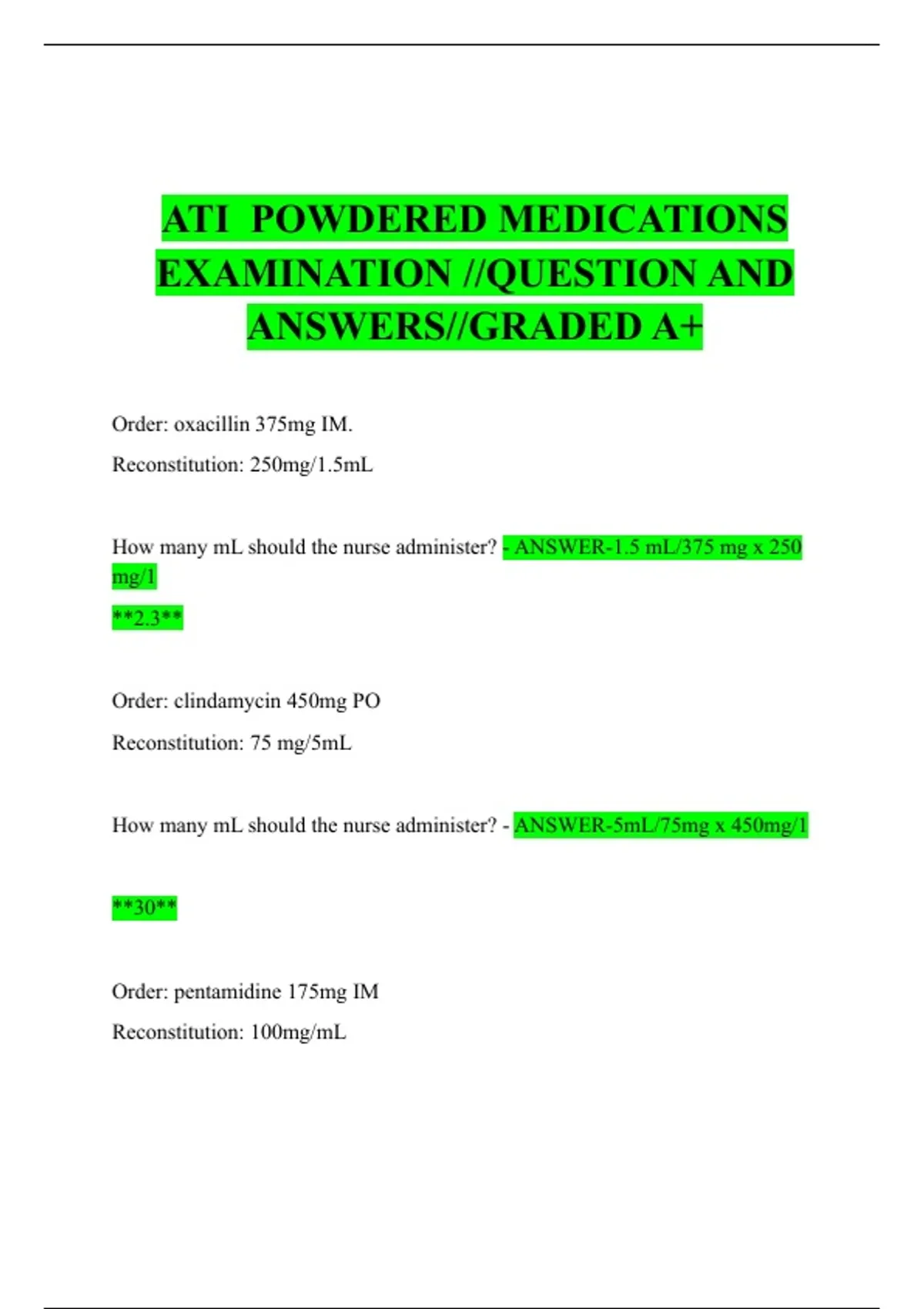 How many mL should the nurse administer? - ANSWER-5mL/75mg x 450mg/1