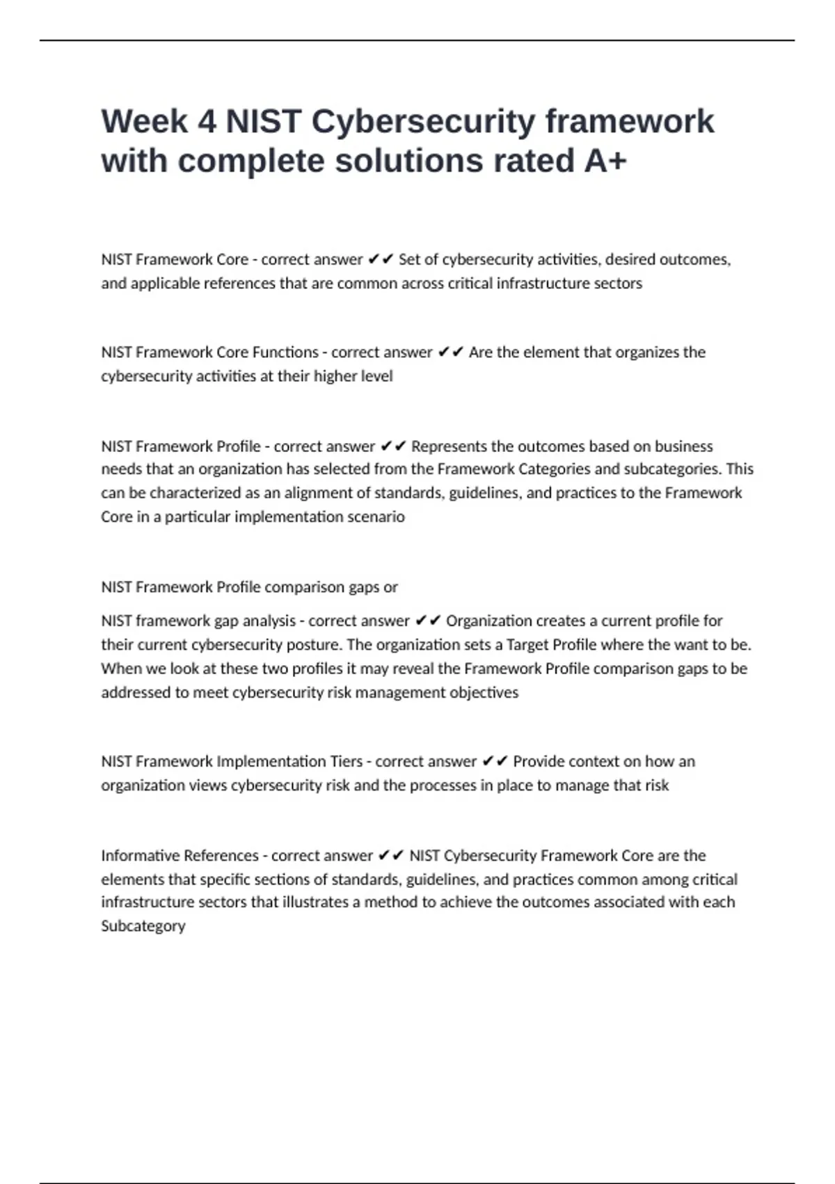 NIST Framework Core - correct answer ✔✔ Set of cybersecurity activities, desired outcomes,