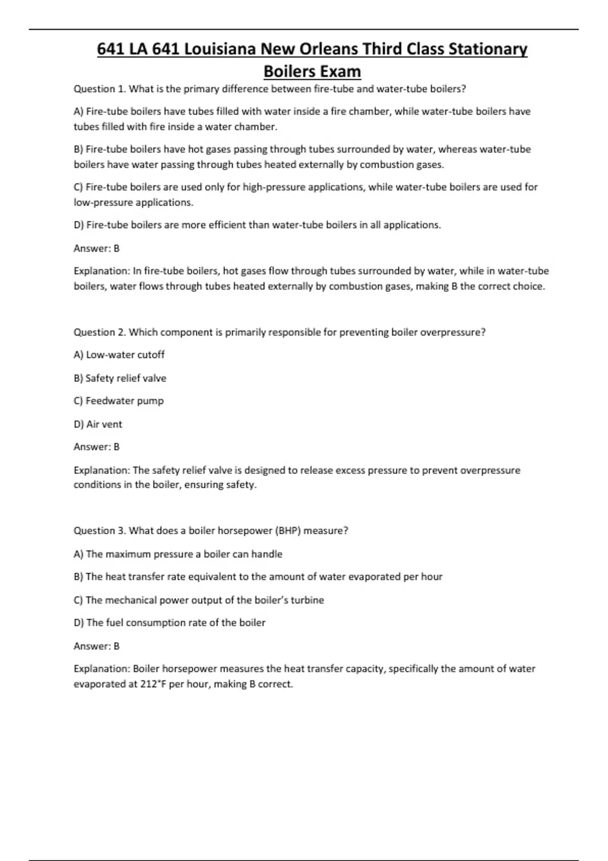 This exam certifies operators of low-pressure and smaller-scale boilers. Topics include combustion basics, steam generation, safety valves, gauges, water chemistry, routine maintenance, and New Orleans code compliance. Third-class operators are restricted to small facilities or residential systems.